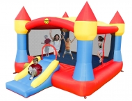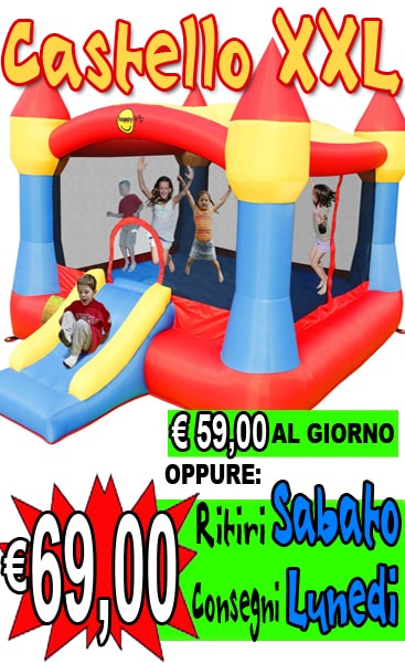 Castello XXL è un gonfiabile cha abbina le sue dimensioni molto grandi ad un peso contenuto che lo rendono semplice da trasportare. Dispone di un grande salterello che riesce a contenere 5/6 bambini che potranno giocare e saltare in assoluta tranquillità grazie alle reti di protezione presenti su tutti i lati. Frontalmente è presente anche uno scivolo non molto ripido che lo rende adatto anche all’uso dei bambini più piccoli. Dotato anche un telo parasole.