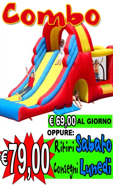 Combo è lo scivolo gonfiabile più amato dai bambini, è composto da un ampio salterello dove potranno saltare e divertirsi in assoluta tranquillità e sicurezza essendo protetto su tutti i lati da morbide reti. Si potranno poi arrampicare su un’avvincente arrampicata ed arrivati in cima troveranno ben 2 scivoli per emozionanti discese di coppia. Studiato in ogni dettaglio, garantisce stabilità anche grazie a 2 zavorre laterali che lo tengono costantemente equilibrato.