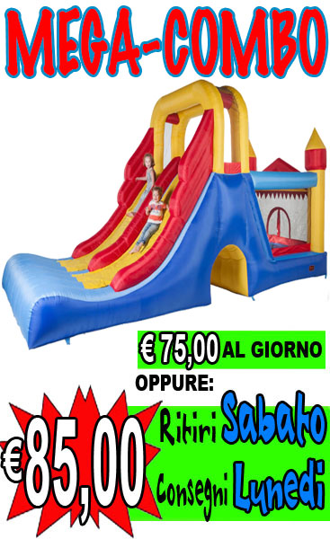 Il Mega Combo è progettato per chi vuole regalare ai bambini un'area di gioco ancora più ampia e coinvolgente. È il gonfiabile ideale per compleanni e feste private a Padova e Vicenza, dove lo spazio per i piccoli si sposa con la tranquillità dei genitori.