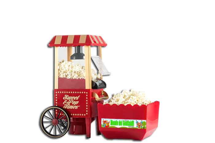 Piccola macchina da tavolo per popcorn, Design retro e uno stile vintage che imita i carretti dei popcorn dei Luna Parck. Nonostante le piccole dimensioni, è estremamente curata in ogni dettaglio e produce ottimi popcorn e sopra ad un tavolo piace moltissimo ai bambini.