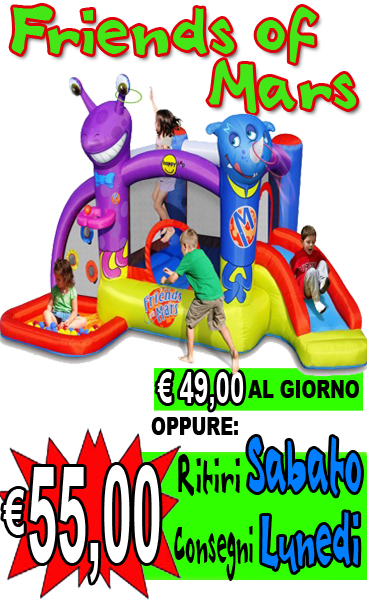 Preparatevi al decollo! Il Friends of Mars è il gonfiabile a tema spaziale che trasformerà la tua festa in un incontro ravvicinato del terzo tipo. Caratterizzato da simpatici extra-terrestri e colori vivaci, è la scelta ideale per i bambini più piccoli che amano lo spazio e le avventure intergalattiche.
