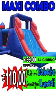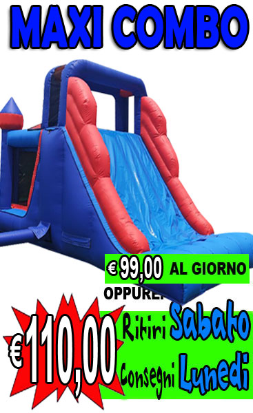 Il Maxi Combo rappresenta il top della gamma per chi cerca prestazioni e resistenza. Con i suoi 6 metri di lunghezza e un'altezza imponente di ben 3,50 metri, questo scivolo offre un ampio salterello che porta ad una discesa ripida e adrenalinica. Realizzato interamente in PVC professionale, garantisce una stabilità superiore senza compromessi.