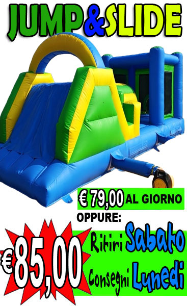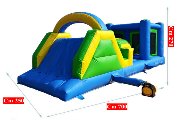 Jump e Slide Pro è il gonfiabile più dinamico e completo della nostra linea professionale. Con una lunghezza di 7 metri, questo percorso offre un ampio salterello che da accesso ad un entusialmante percoso ad ostacoli. Realizzato interamente in PVC professionale.